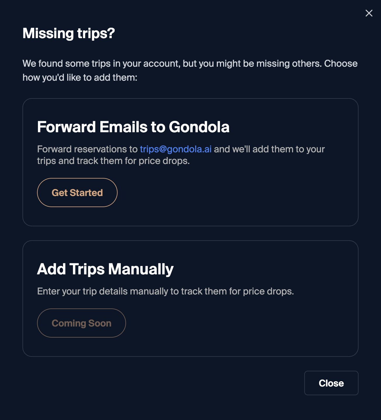 If a trip isn’t showing on your Trips page, you can forward the confirmation email to Gondola. At the bottom of your Trips page, add the email address you’ll forward from, then send over your hotel or flight confirmation to Gondola. We’ll add it automatically and start tracking it for savings. You can also contact concierge@gondola.ai if you need help.