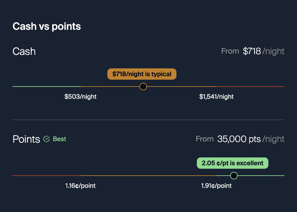 Compare cash and points side by side with your rates shown against historical pricing for that property, so you can easily see if you have an exceptional deal. Gondola does the math for you and highlights if paying cash or using points offers the better value.