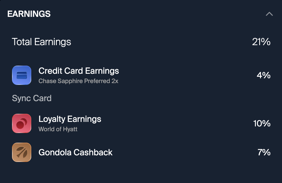The earnings stack shows exactly what you earn when you book. Gondola considers your linked credit cards and suggests the optimal way to pay in order to maximize your earnings. We'll stack that with your hotel points and perks and Gondola Cashback so you can see your total estimated earnings at a glance.