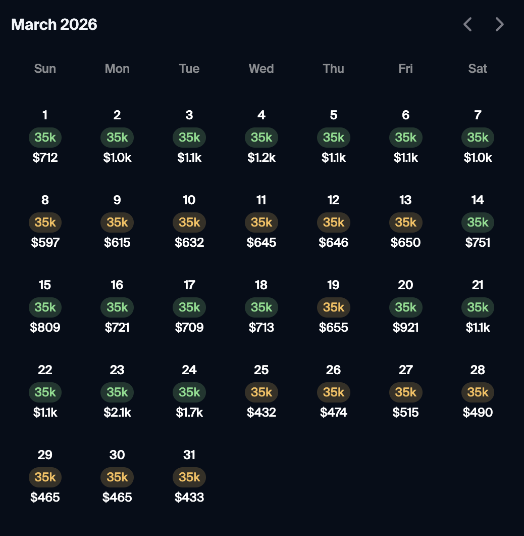 Scan pricing and points across nearby dates with the calendar view. If your dates are flexible, this is the quickest way to spot a better cash deal or a way to get more value from your points.