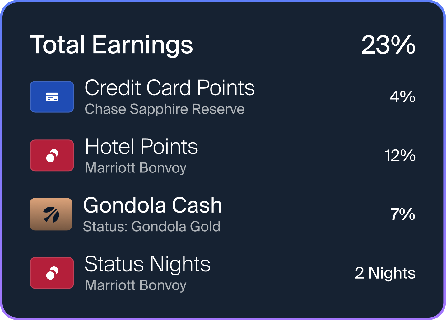 Gondola triple stacking your credit card points, hotel points, and Gondola Cash to maximize your earnings on every stay. The average traveler earns 16% of their room rate back with every booking. With the right cards, loyalty status, and Gondola Status Tier, you could earn upwards to 30% back every time.