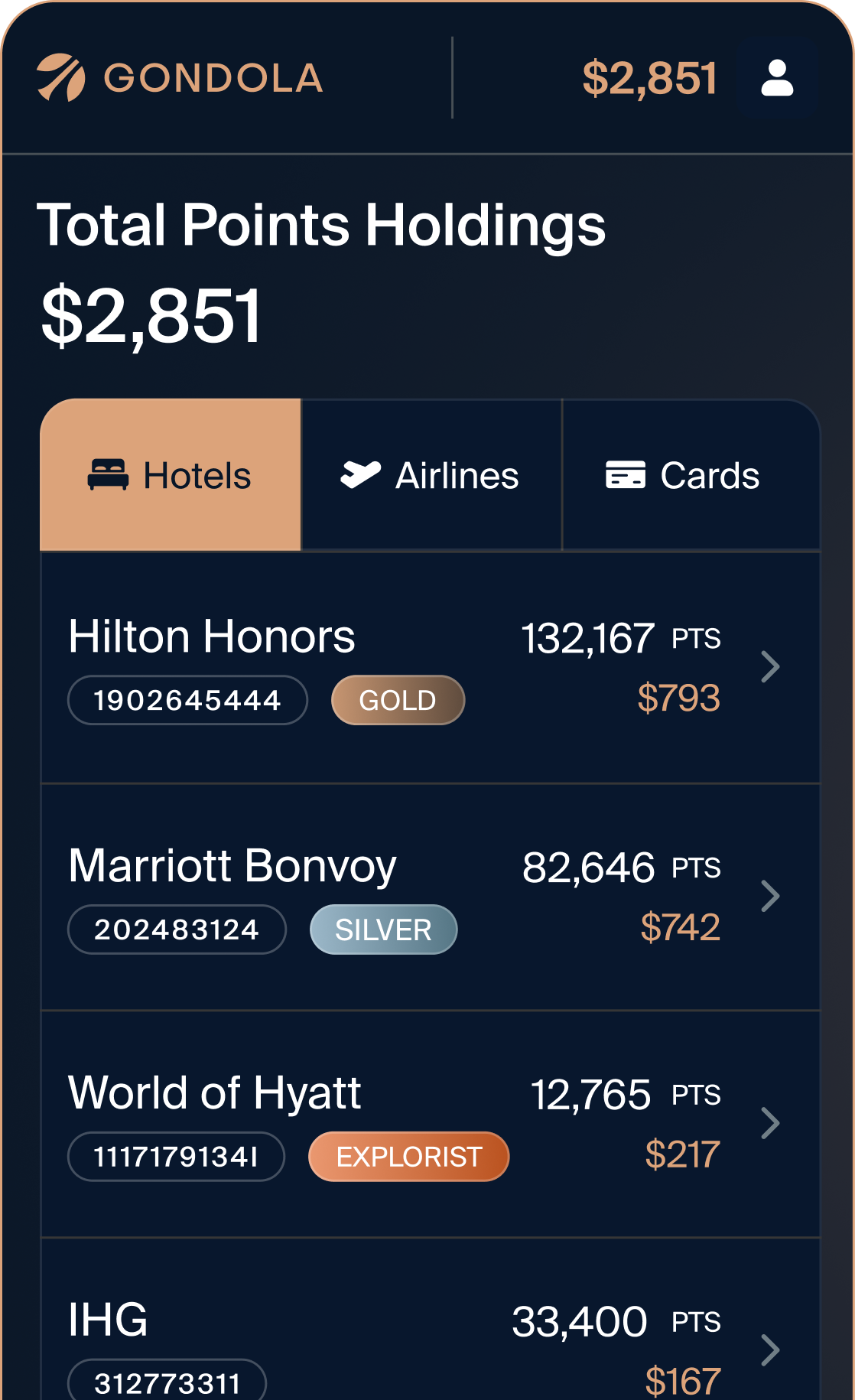Your Loyalty Dashboard gives you a complete snapshot of your travel rewards. Automatically track your hotel points, airline miles, and credit card points in one place. It’s designed to help you understand the full value of your loyalty portfolio at a glance, with the average traveler discovering over $3100 in unspent points when they join.